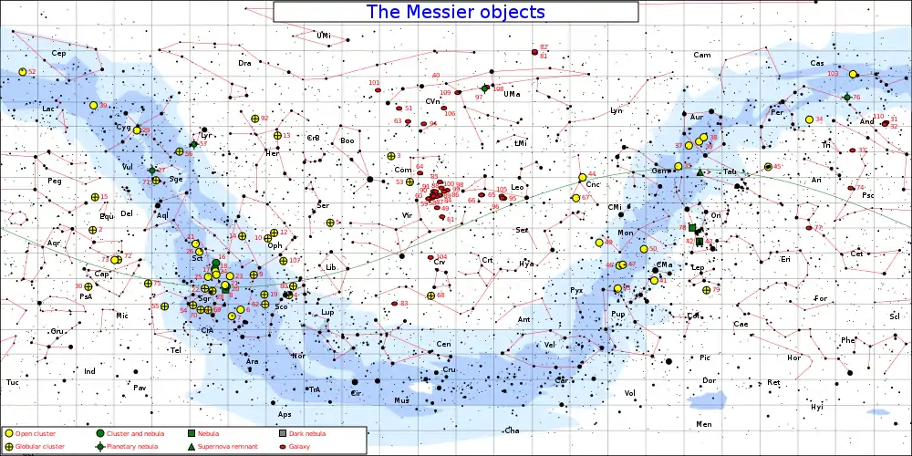M45 | Pleiades | File:Pleiades Lanoue.png | Open cluster | 0.4 | Taurus | 1.4 | |