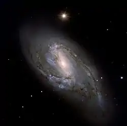 Messier 66 (also known as NGC 3627) is an w:intermediate spiral galaxy about 36 million w:light-years away in the w:constellation Leo. It was discovered by w:Charles Messier in w:1780. M66 is about 95 thousand light-years across[3] with striking dust lanes and bright star clusters along sweeping spiral arms.[4] M66 is part of the famous w:Leo Triplet, a small w:group of galaxies that also includes M65 and w:NGC 3628.