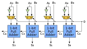 Using this simple relationship, we can see that addition and subtraction can be performed using the same hardware. Using this setup, however, care must be taken to invert the value of the second operand if we are performing subtraction. Note also that in twos-compliment arithmetic, the value of the second operand must not only be inverted, but 1 must be added to it. For this reason, when performing subtraction, the carry input into the LSB should be a 1 and not a zero.