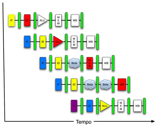In this image we can see "bubbles" drawn where data hazards occur. A bubble signifies that the instruction has stalled in the pipeline until a previous instruction completes. Once the previous instruction has completed, the stalled instruction continues moving.