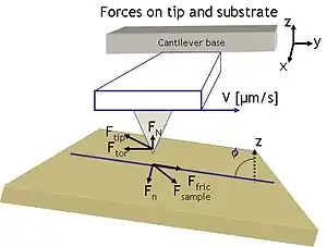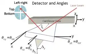 If the sample is scanned sideways in the y direction, the frictional forces will apply a torque on the cantilever, bending it sideways and this can be used to measure the frictional forces. The lateral force gives both a lateral and torsional deflection of the tip. Only the torsional can be detected in the photodetector.