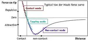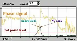 Non-contact mode: If we oscillate the cantilever at a higher frequency than its free resonance and use the feedback loop to maintain a oscillation amplitude setpoint slightly lower than that of the free oscillation, it will move the tip down until the attractive forces lower the resonance frequency and makes the oscillation amplitude drop to the setpoint level.