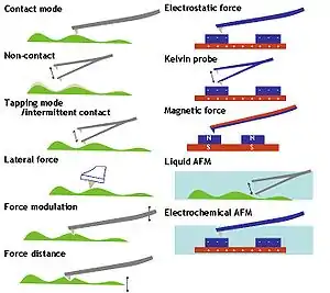 - Kelvin probe microscopy. By applying an oscillating voltage to an oscillating cantilever in non-contact mode and measuring the charge induced oscillations, a map can be made of the surface charge distribution.