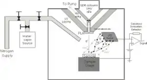 The standard Everly-Thornhart SE detector would not work under such conditions since it would create a discharge in the low pressure gas. Instead a "gaseous secondary electron detector (GSD)" is used, as shown in the figure below. The GSD measures the current of a weak cascade discharge in the gas, which is seeded by the emission of electrons from the sample.