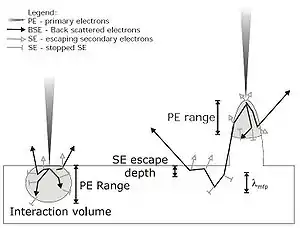 SEM can be used for thicker specimens. The electrons that escape from the sample in a new direction compared to the PE due to elastic collisions are called backscattered electrons (BSE).