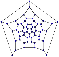 In mathematical terms, the structure of a fullerene is a trivalent convex polyhedron with pentagonal and hexagonal faces. In graph theory, the term fullerene refers to any 3-regular, planar graph with all faces of size 5 or 6 (including the external face). It follows from Euler's polyhedron formula, |V|-|E|+|F| = 2, (where |V|, |E|, |F| indicate the number of vertices, edges, and faces), that there are exactly 12 pentagons in a fullerene and |V|/2-10 hexagons.