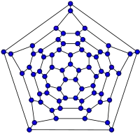 The smallest fullerene is the w:dodecahedron--the unique C20. There are no fullerenes with 22 vertices.[18] The number of fullerenes C2n grows with increasing n = 12,13,14..., roughly in proportion to n9. For instance, there are 1812 non-isomorphic fullerenes C60. Note that only one form of C60, the buckminsterfullerene alias w:truncated icosahedron, has no pair of adjacent pentagons (the smallest such fullerene). To further illustrate the growth, there are 214,127,713 non-isomorphic fullerenes C200, 15,655,672 of which have no adjacent pentagons.