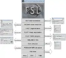 FSL is a comprehensive library of analysis tools for FMRI, MRI and DTI brain imaging data. It could be used either by FSL main GUI or the commond-lines. The advantage of the GUI lies in its simplicity but the drawback is the less flexibility comparing to the command-lines. FSLView as the display tool could be completely separate use from processing and analysis. Currently FSL only accepts the input files in NIFTI format, and the DICOM files need to be converted to NIFTI after acquisition and before processing. The convertion from DICOM to NIFIT could be fulfilled by several methods, such as dcm2nii from mricron or dcmstack. In the GUI there are nine popular modules are defined, and depending on the input file types, they fall into functional-oriented, structural-oriented or diffusion-oriented modules. The structural-oriented functions include "BET brain extraction", "FAST segmentation", "FLIRT: linear registration"; the functional-oriented functions invole "SUSAN noise reduction","FEAT FMRI analysis" and "MELODIC ICA"; the DTI-oriented functions incorporate "FDT diffusion". Besides these functional modules, there is a simulator called "POSSIUM MRI simulator", which is a software tool to produce realistic simulated MRI and FMRI images or time series. POSSUM (Physics-Oriented Simulated Scanner for Understanding MRI) includes tools for the pulse sequence generation, signal generation, noise addition and image reconstruction.