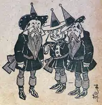 Tri ek les esed viros e un esed fema, e omnes esed stranjim vestat. Les portat rondi chapeles kel vadad supru a mikri punte ye un pede super lesen kapes, kun mikri kloches sirk li bordes kel klochetad dolsim durant ke les movad. Li chapeles del viros esed blui; li mikri feman chapele esed blanki, e la portad blanki robe kel pendad kom faldes fro lan shultres. Super lu esed arosat mikri astres kel sintileskad in li sune kom diamantes. Li viros esed vestat in blue, del sami kolore kam sen chapeles, e portad bonim polit butes kun profundi rule de blue an li kulmines. Li viros, Dorothy pensad, esed sirk tam oldi kam Onklo Henry, den du ek les haved barbes. Ma li mikri fema esed sinduto multi plu oldi. Lan fasie esed kovrat per sulkes, lasen hares esed preske blanki, e la marchad kelkigrad rigidim.