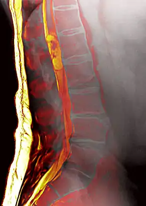 Image fusion of plain radiograph and T2W MR image of lumbar spine in a patient with an ependymoma centered at L1 and a limbus vertebra at L4. These images were registered manually using the OsiriX Zoom and Move tools.