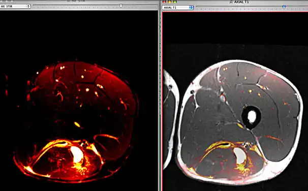 Fusion image between axial STIR and T1 images of a football player with a hamstring hematoma. These images were performed during the same imaging exam and were automatically aligned by OsiriX.