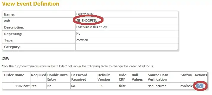 Now a screen opens, displaying information about the event and about the CRF's in that event. Here you can find your first ingredient: the OpenClinica ID (OID) of the StudyEvent, in this case "SE_ENDOFSTU". Write this down for later use. Then click on the magnifier-icon on the right of the CRF you want to use for your rule.