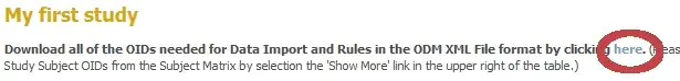 In the first line screen that appears (Download all of the OIDs needed for Data Import and Rules in the ODM XML File format by clicking here.) you find the link to the StudyMetaData-file