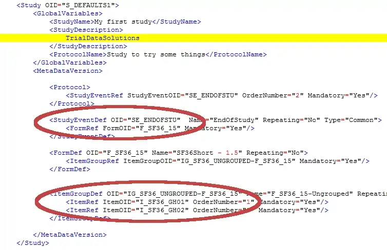 There is however one last thing to consider: the OID for the group has an extra extension in the StudyMetaData-file: in the example above this is ItemGroupOID="IG_SF36_UNGROUPED-F_SF36_15". So the OID of the form is appended to the OID of the ItemGroup. To use this GroupItem OID you must not use the extension!