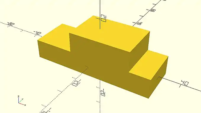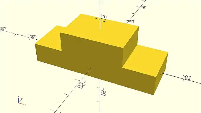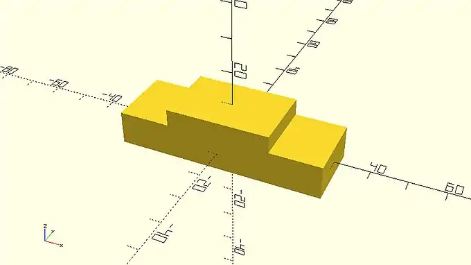 two_cubes_with_explicit_small_overlap.scad cube([60,20,10],center=true); translate([0,0,10 - 0.001]) cube([30,20,10],center=true); |