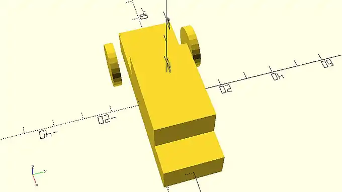 car_body_and_misaligned_front_wheels.scad cube([60,20,10],center=true); translate([5,0,10 - 0.001]) cube([30,20,10],center=true); translate([-20,-15,0]) rotate([90,0,0]) cylinder(h=3,r=8); translate([-20,15,0]) rotate([90,0,0]) cylinder(h=3,r=8); |