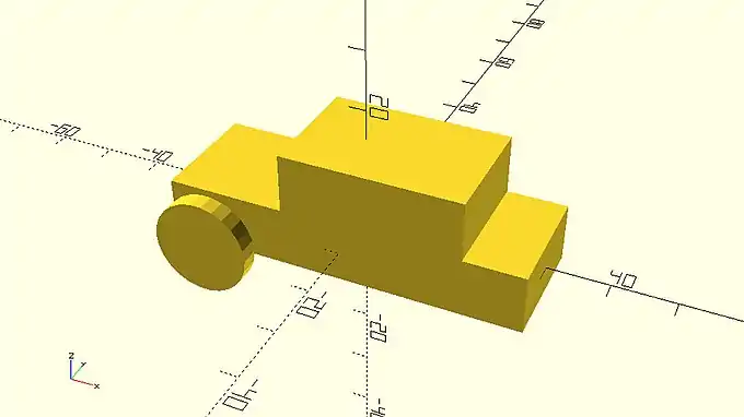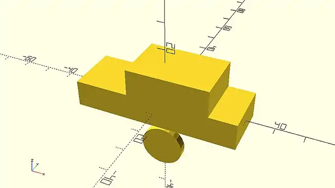 car_body_and_front_left_wheel.scad cube([60,20,10],center=true); translate([5,0,10 - 0.001]) cube([30,20,10],center=true); translate([-20,-15,0]) rotate([90,0,0]) cylinder(h=3,r=8); |