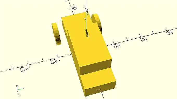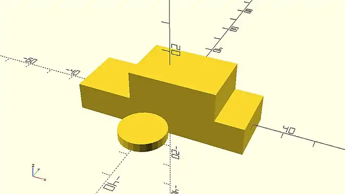 two_cubes_and_a_rotated_cylinder.scad cube([60,20,10],center=true); translate([5,0,10 - 0.001]) cube([30,20,10],center=true); rotate([90,0,0]) translate([0,-20,0]) cylinder(h=3,r=8); |