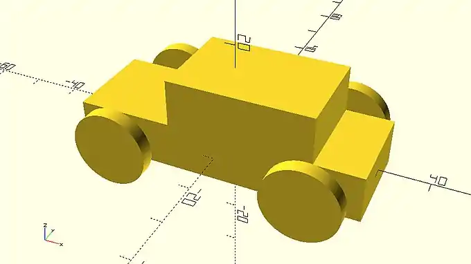 completed_car_commented.scad $fa = 1; $fs = 0.4; // Car body base cube([60,20,10],center=true); // Car body top translate([5,0,10 - 0.001]) cube([30,20,10],center=true); // Front left wheel translate([-20,-15,0]) rotate([90,0,0]) cylinder(h=3,r=8,center=true); // Front right wheel translate([-20,15,0]) rotate([90,0,0]) cylinder(h=3,r=8,center=true); // Rear left wheel translate([20,-15,0]) rotate([90,0,0]) cylinder(h=3,r=8,center=true); // Rear right wheel translate([20,15,0]) rotate([90,0,0]) cylinder(h=3,r=8,center=true); // Front axle translate([-20,0,0]) rotate([90,0,0]) cylinder(h=30,r=2,center=true); // Rear axle translate([20,0,0]) rotate([90,0,0]) cylinder(h=30,r=2,center=true); |