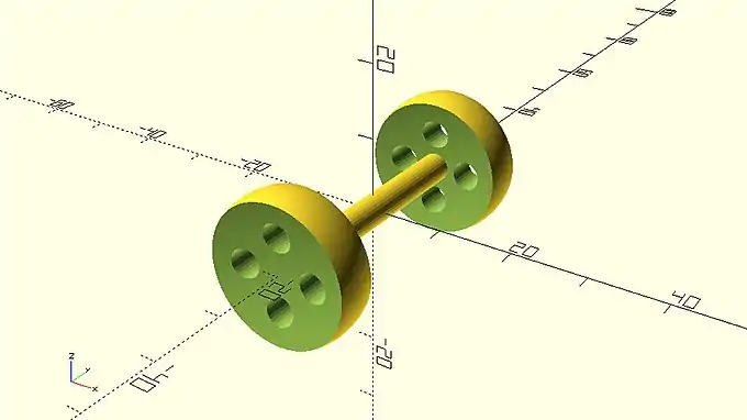 You should notice that something unexpected happened. A wheel has been created at the origin. This is the object of the simple_wheel script. When you use include, OpenSCAD treats the whole external script that you are including as if it was a part of your current script. In the simple_wheel.scad script, aside from the simple_wheel module definition, there is also a call to the simple_wheel module which creates a wheel object. As a result of using the include command this object is also created in the car’s model. This is something that you are going to change by using the use instead of the include command, but don’t bother about it for a moment.