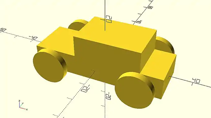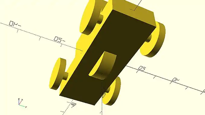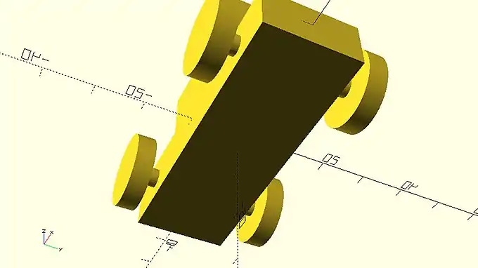 car_with_wheels_created_by_included_module.scad include <simple_wheel.scad> $fa = 1; $fs = 0.4; wheel_radius = 8; base_height = 10; top_height = 10; track = 30; // Car body base cube([60,20,base_height],center=true); // Car body top translate([5,0,base_height/2+top_height/2 - 0.001]) cube([30,20,top_height],center=true); // Front left wheel translate([-20,-track/2,0]) simple_wheel(); // Front right wheel translate([-20,track/2,0]) simple_wheel(); // Rear left wheel translate([20,-track/2,0]) simple_wheel(); // Rear right wheel translate([20,track/2,0]) simple_wheel(); // Front axle translate([-20,0,0]) rotate([90,0,0]) cylinder(h=track,r=2,center=true); // Rear axle translate([20,0,0]) rotate([90,0,0]) cylinder(h=track,r=2,center=true); |