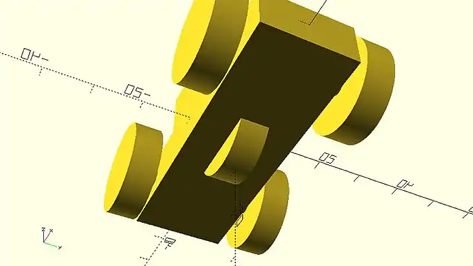 car_with_simple_wheels.scad $fa = 1; $fs = 0.4; wheel_radius = 8; base_height = 10; top_height = 10; track = 30; // Car body base cube([60,20,base_height],center=true); // Car body top translate([5,0,base_height/2+top_height/2 - 0.001]) cube([30,20,top_height],center=true); // Front left wheel translate([-20,-track/2,0]) rotate([90,0,0]) cylinder(h=3,r=wheel_radius,center=true); // Front right wheel translate([-20,track/2,0]) rotate([90,0,0]) cylinder(h=3,r=wheel_radius,center=true); // Rear left wheel translate([20,-track/2,0]) rotate([90,0,0]) cylinder(h=3,r=wheel_radius,center=true); // Rear right wheel translate([20,track/2,0]) rotate([90,0,0]) cylinder(h=3,r=wheel_radius,center=true); // Front axle translate([-20,0,0]) rotate([90,0,0]) cylinder(h=track,r=2,center=true); // Rear axle translate([20,0,0]) rotate([90,0,0]) cylinder(h=track,r=2,center=true); |
