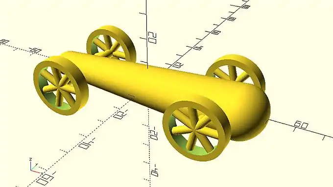… module rounded_simple_wheel(wheel_radius=12, wheel_width=4, tyre_diameter=6) { rotate([90,0,0]) { rotate_extrude(angle=360) { translate([wheel_radius-tyre_diameter/2,0]) circle(d=tyre_diameter); } cylinder(h=wheel_width, r=wheel_radius - tyre_diameter/2, center=true); } } … |
