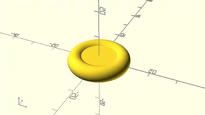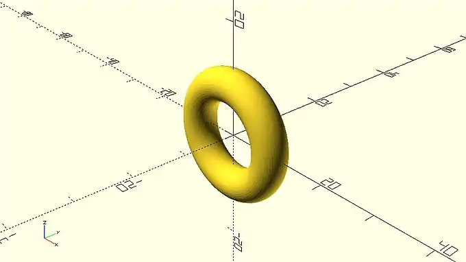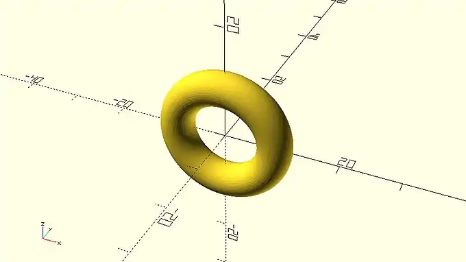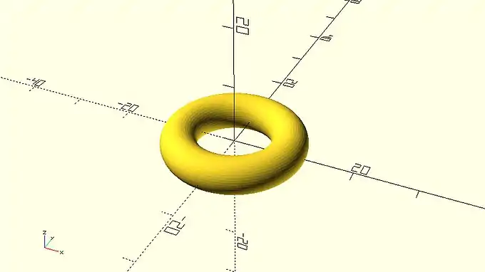 This donut shaped object can’t be created with the use of the sphere, cube and cylinder primitives. Instead it requires the use of 2D primitives and a new command which can create 3D shapes from 2D profiles. Specifically, the donut can be created by first defining a circular 2D profile using the circle primitive and then rotationally extruding this profile using the rotate_extrude command.