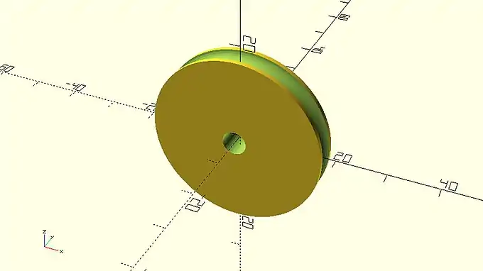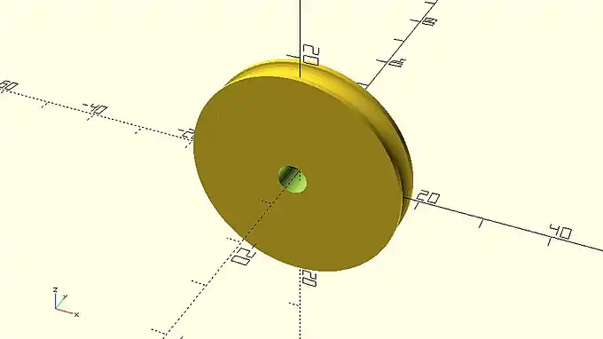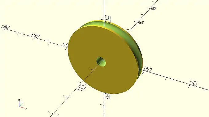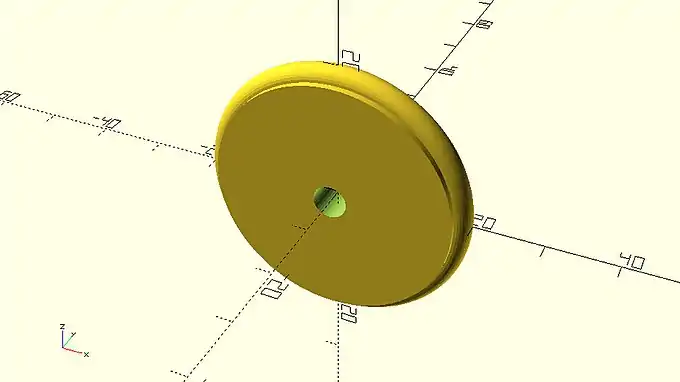 … rounded_simple_wheel(wheel_radius=20, wheel_width=6, tyre_diameter=4, axle_diameter=5); … |