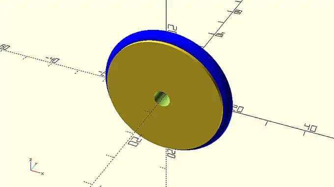 You should remember that axisymmetric objects can be completely created out of a rotate_extrude command. The previous wheel design is a concrete example of this. Whether you decide to create an axisymmetric object by supplying the 2D profile of the whole object and by using a single rotate_extrude or by using a rotate_extrude command only for its parts that can’t be created in any other way, depends on each case and is up to you. If you wanted for example to further modularize your wheel designs and separate them into combinable tire and rim modules, you would inevitably need to create the donut-shaped tire using a rotate_extrude command. Since in this case the rim of the wheel would be a separate module without a rotate_extrude command already present in it, the simplest and most straight forward way to create it would be by using a cylinder command.
