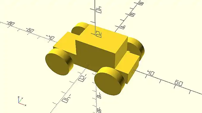 car_with_additional_variables.scad use <vehicle_parts.scad> $fa = 1; $fs = 0.4; wheelbase = 40; track = 35; half_wheelbase = wheelbase/2; half_track = track/2; // Body body(); // Front left wheel translate([-half_wheelbase,-half_track,0]) simple_wheel(); // Front right wheel translate([-half_wheelbase,half_track,0]) simple_wheel(); // Rear left wheel translate([half_wheelbase,-half_track,0]) simple_wheel(); // Rear right wheel translate([half_wheelbase,half_track,0]) simple_wheel(); // Front axle translate([-half_wheelbase,0,0]) axle(track=track); // Rear axle translate([half_wheelbase,0,0]) axle(track=track); |