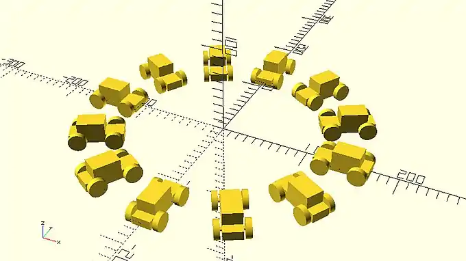 circular_pattern_of_cars.scad … r = 140; // pattern radius n = 12; // number of cars step = 360/n; for (i=[0:step:359]) { angle = i; dx = r*cos(angle); dy = r*sin(angle); translate([dx,dy,0]) rotate([0,0,angle]) car(); } … |