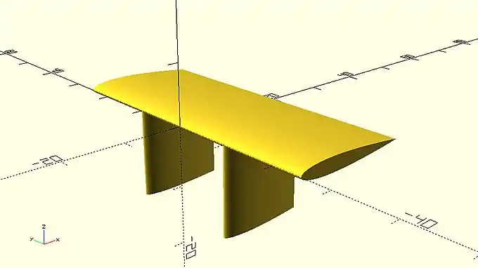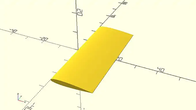 spoiler_wing.scad … module naca_wing(span,chord,t,n,center=false) { linear_extrude(height=span,center=center) { naca_airfoil(chord,t,n); } } … rotate([90,0,0]) naca_wing(span=50,chord=20,t=0.12,n=500,center=true); … |