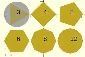 script for these examples translate([-42, 0]){circle(20,$fn=3);%circle(20,$fn=90);} translate([ 0, 0]) circle(20,$fn=4); translate([ 42, 0]) circle(20,$fn=5); translate([-42,-42]) circle(20,$fn=6); translate([ 0,-42]) circle(20,$fn=8); translate([ 42,-42]) circle(20,$fn=12);