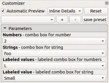 The Customizer feature provides a graphic user interface for editing model parameters. With this feature one does not need to edit the code to change the values of the parameters / variables. Programmers can create templates for a given model, and customize these further to adapt to different needs / users. Sets of parameter values can also be saved, which effectively saves a variant of a particular model.