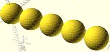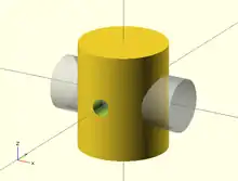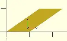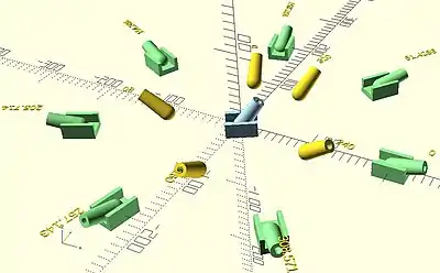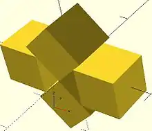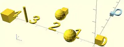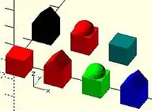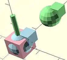 Examples cube(5); x = 4+y; rotate(40) square(5,10); translate([10,5]) { circle(5); square(4); } rotate(60) color("red") { circle(5); square(4); } color("blue") { translate([5,3,0]) sphere(5); rotate([45,0,45]) { cylinder(10); cube([5,6,7]); } }
