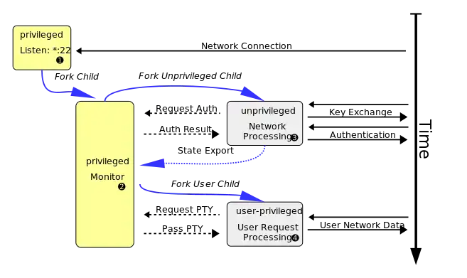 Privilege separation is when a process is divided into sub-processes, each of which have just enough access to just the right services to do their part of the job. An underlying principle is that of least privilege, which is where each process has exactly enough privileges to accomplish a task, neither more nor less. The goal of privilege separation is to compartmentalize any corruption and prevent a corrupt process from accessing other parts of the system. Privilege separation is applied in OpenSSH by using several levels of access, some higher some lower, to run sshd(8) and its subsystems and components. The SSH server ➊ starts out with a privileged process ➋ which then creates an unprivileged process ➌ to work with the network traffic. Once the user has authenticated, another unprivileged process is created ➍ with the privileges of that authenticated user. See the "Sequence Diagram for OpenSSH Privilege Separation". As seen in the diagram, a total of four processes get run to create an SSH session. One process, the server, remains and listens for new connections and spawn new child processes.