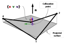 As explained before, the boundary condition problem requires the declaration of several collocation points. In OpenVOGEL, three collocation points are computed for each panel: the inner control point, the middle control point, and the outer control point. The inner one is only used to compute the inner potential of the thick bodies. The middle one is used as origin for the local coordinates (to complete the definition of the projected panel) and to compute the velocity in slender surfaces. Finally, the outer one is used to evaluate the velocity on thick bodies. The position of the inner and outer points is computed using the middle point and the normal direction times an epsilon scalar. The middle point is always computed using the average coordinates of the panel nodes.