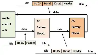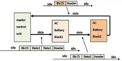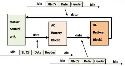 The data transfer is always initiated by the master control unit. It sends data to the first battery pack. Then, the first battery pack sends the data to the next battery pack and so on. The last battery pack returns data to the master control unit.