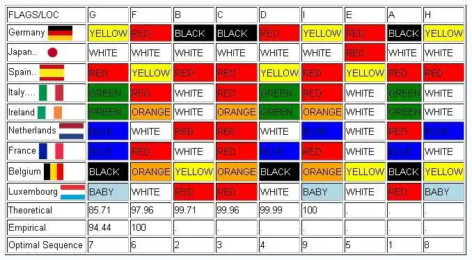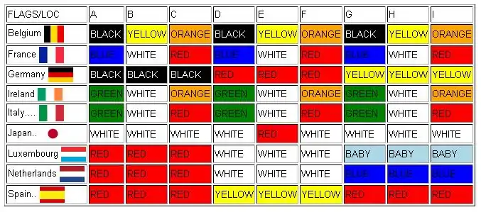 FLAGS/LOC,A,B,C,D,E,F,G,H,I BELGIUM,BLACK,YELLOW,ORANGE,BLACK,YELLOW,ORANGE,BLACK,YELLOW,ORANGE FRANCE,BLUE,WHITE,RED,BLUE,WHITE,RED,BLUE,WHITE,RED GERMANY,BLACK,BLACK,BLACK,RED,RED,RED,YELLOW,YELLOW,YELLOW IRELAND,GREEN,WHITE,ORANGE,GREEN,WHITE,ORANGE,GREEN,WHITE,ORANGE ITALY,GREEN,WHITE,RED,GREEN,WHITE,RED,GREEN,WHITE,RED JAPAN,WHITE,WHITE,WHITE,WHITE,RED,WHITE,WHITE,WHITE,WHITE LUXEMBOURG,RED,RED,RED,WHITE,WHITE,WHITE,BABY,BABY,BABY NETHERLANDS,RED,RED,RED,WHITE,WHITE,WHITE,BLUE,BLUE,BLUE SPAIN,RED,RED,RED,YELLOW,YELLOW,YELLOW,RED,RED,RED HELIGOLAND,GREEN,GREEN,GREEN,RED,RED,RED,WHITE,WHITE,WHITE