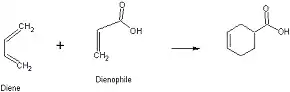 Another interesting conjugated diene reaction is the Diels-Alder reaction, in which a conjugated diene reacts with an alkene (called a "dienophile" in this case) in order to yield a cyclic product. In Diels-Alder type reactions, the substituent on the dienophile will go into either an exo or endo position in the final product. ("Endo" in this case meaning trans to the substituents on the ends of the diene, and "exo" meaning the same thing, only cis.)