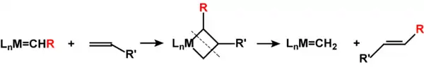 It occurs via the carbene species nowaday known as Schrock's carbenes