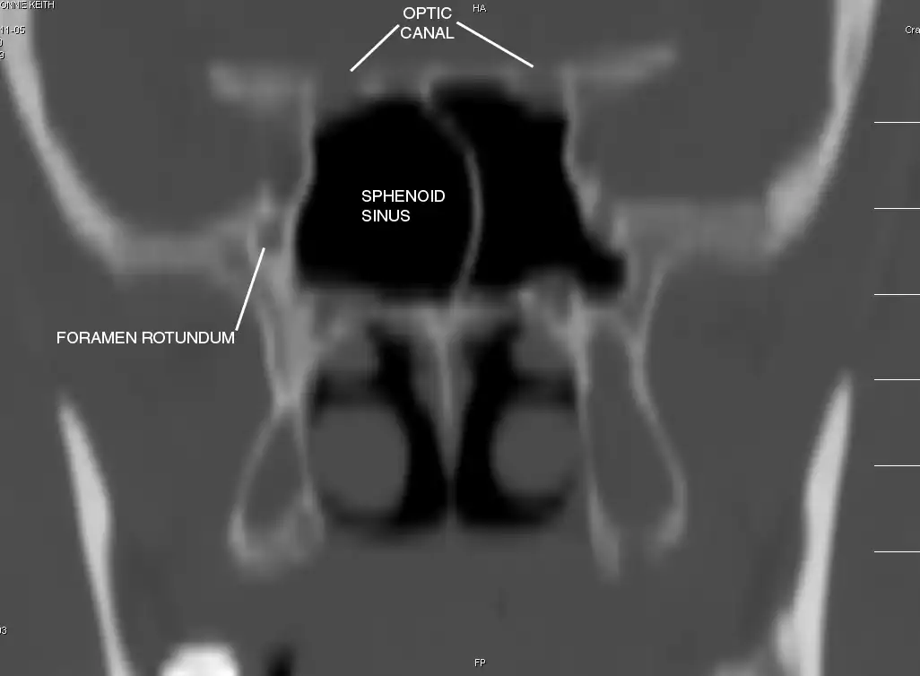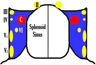 - C = Carotid Artery: often with bony dehiscence into sphenoid. Together with CN II forms opticocarotid recess.