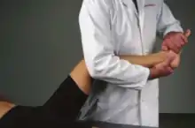 Cruciate Ligament Sprain: The patient is supine. The physician places one pal over the anterior distal femur and the other pal over the tibial tuberosity. The physician adds a compressive force to approximate the femur and the tibia, followed by internal and external rotation to achieve a point of balanced tension. | ![]() Cruciate Ligament Sprain BLT |