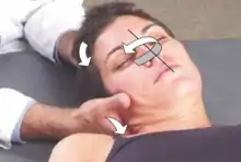 A. With the right hand on the supine patient's head, the cervical spine is neutralized by a slight flexion followed by application of an activating force in the form of a gentle axial compression while the patient's head is positioned toward flexion, right sidebending, and right rotation for 3 to 5 seconds.