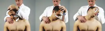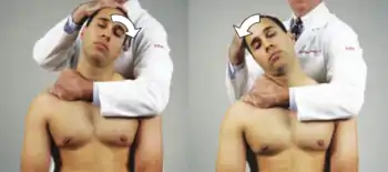 Cervical Spine FPR: The patient lies supine. The physician supports the head with the hand on the same side as the prominent articular pillar. The cervcal spine is neutralized with a slight flexion followed by the application of an activating force in the form of a gentle axial compression while the patient's head is positioned toward the dysfunction for 3 to 5 seconds. | ![]() Cervical FPR |