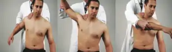 Elevated Sternoclavicular (SC) joint: The patient is seated. The physician stands behind the patient with the left hand reaching around in front of the patient. The physician's thumb is placed over the proximal end of the patient's right clavicle. The thumb maintains constant downward pressure. The other hand grasps just below the elbow on the side of the dysfunctional clavicle and the arm is brought toward flexion from adduction to abduction. With a continuous backstroke motion, similar to throwing a softball, the arm is circumducted toward extension until it is at the side of the patient. At this point, the arm is brought forward and placed across the chest.