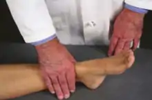 Posterior Tibia on Talus: The patient is supine. The physician places their palm across the distal tibia with the MCP joint of the index finger proximal to the distal tibia. the physician presses downward and then uses the other hand on top of the hand on the distal tibia and assesses internal and external rotation by applying more pressure until a point of balanced tension is achieved. | ![]() Posterior Tibia on Talus BLT |