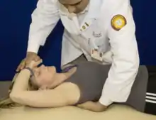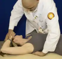 Exhalation dysfunction key rib 2 (posterior scalene) | Patient is supine. Ask patient to place the dorsum of their dysfunction-side hand on their forehead, and then rotate their head away from the side of the key rib. Contact the key rib as close to the costotransverse junction as possible with one hand, and stabilize the patient’s head/hand with the other hand. Ask the patient to perform a forced maximal inhalation and simultaneously try to lift their head off the table. Resist their head motion, and during the inhalation phase apply a caudad force on the key rib at the costotransverse junction. | ![]() Rib 2 exhalation dysfunction |