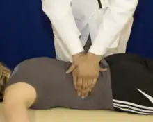 Exhalation dysfunction key ribs 11-12 (quadratus lumborum) | Patient is prone. Physician is standing on the side of the table opposite the key rib. Contact the key rib with firm anterior pressure over the costotransverse junction of rib with one hand, and hold onto the ASIS on the dysfunctional side with the other hand. Ask the patient to perform a cycle of forced maximal inhalation and exhalation. During the inhalation phase, increase anterior/lateral pressure on the costotransverse junction of the key rib, while pulling posteriorly slightly on the ASIS to stabilize the pelvis. | ![]() Ribs 11-12 exhalation dysfunction |